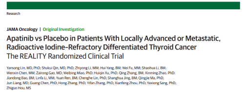 2021年12月16日,权威医学杂志《JAMA Oncology》(影响因子31.777)在线发表阿帕替尼的一项III期临床研究(REALITY)——甲磺酸阿帕替尼片治疗局部进展/转移性放射性碘难治性分化型甲状腺癌(RAIR-DTC)患者的多中心、随机、双盲、安慰剂对照临床研究。此研究由北京协和医院的林岩松教授和南京金陵医院的秦叔逵教授发起,在全国21个研究中心展开,由尊龙凯时人生就是博医药中央医学事务部团队支持完成。