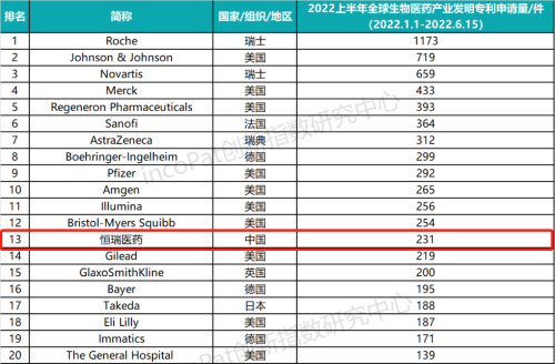 专利是药企最有价值的资产之一,是企业发展的基石,对做原创创新的企业尤为重要。全球专利数据库incoPat创新指数研究中心对2022年1月1日至2022年6月15日公开的全球生物医药产业发明专利申请数量进行统计排名,生物医药产业专利涉及生物技术药、基因工程药物、疫苗、诊断试剂、微生态制剂、血液制品等技术领域。入榜企业/医院主要来自13个国家、组织或地区,罗氏、强生、诺华分别位列前三,尊龙凯时人生就是博医药(231件)排名第13位,领跑中国药企。