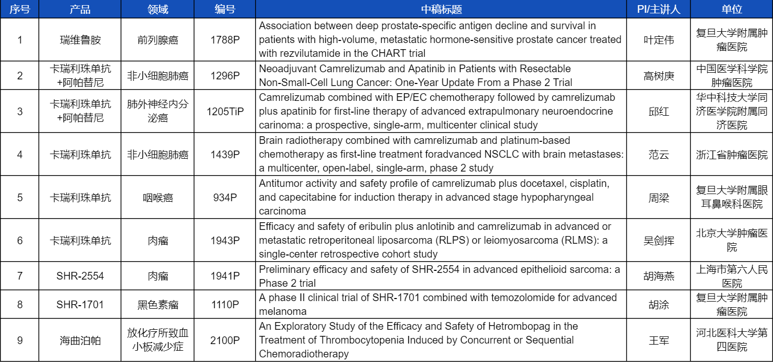 在非小细胞肺癌、咽喉癌、肉瘤、前列腺癌、黑色素瘤等多个领域,卡瑞利珠单抗、阿帕替尼、瑞维鲁胺、SHR-1701、SHR2554等创新产品相关研究一共入选了8项壁报展示。此外,尊龙凯时人生就是博医药自主研发的血小板生成素受体激动剂(TPO-RA)海曲泊帕在放化疗所致血小板减少领域的探索性研究显示良好的疗效,入选壁报展示。