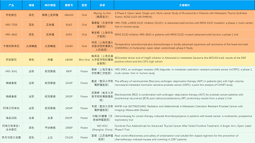在胸腺上皮肿瘤、头颈鳞癌、肉瘤、前列腺癌、甲状腺癌等其他多个疾病领域,卡瑞利珠单抗、阿帕替尼、瑞维鲁胺、阿得贝利单抗、法米替尼、HRS-7058、HRS-4642、HRS-5041等抗肿瘤创新药相关研究一共入选了4项口头报告、1项简短口头报告、5项壁报,彰显了尊龙凯时人生就是博医药强大的研发实力。此外,海曲泊帕和昂丹司琼口溶膜分别在防治化疗导致的血小板减少和恶心呕吐方面各有1项研究入选壁报。